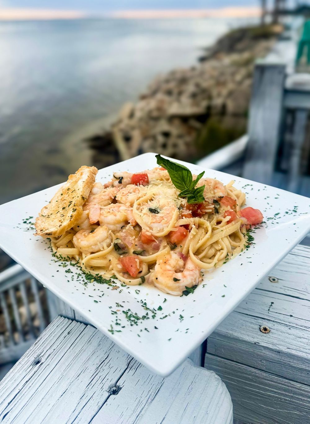 Gulf shrimp, diced red onions, tomatoes, fresh basil and Linguine in a white wine butter garlic sauce, topped with Parmesan cheese and garlic bread