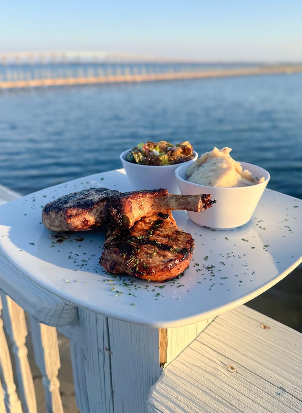 Two 8oz bone-in center-cut pork chops chargrilled